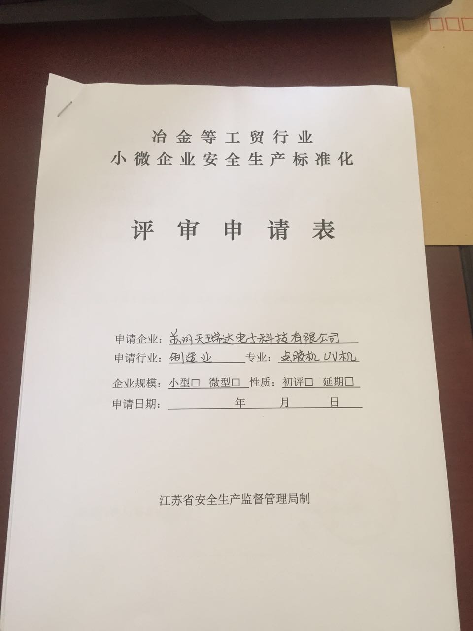 一大早,天瑞達點膠機就接到了江蘇省安全生產標準化評審申請表,做生產,就是要安全第一!