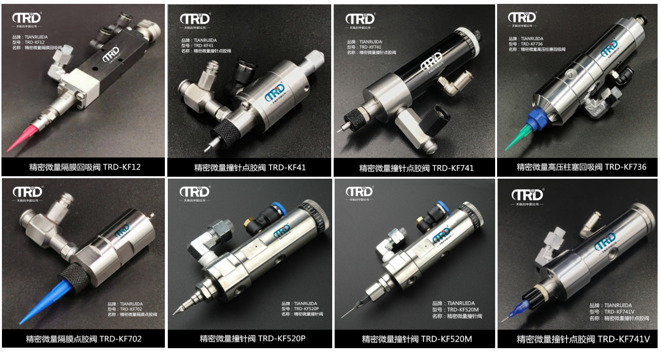 產品介紹TRD-KF41精密微量撞針點膠閥比傳統撞針式的點膠閥小60%,具有零殘較量、大小一致的膠點,涂線均衡,不跑偏,涂膠精度高,點膠閥反應快速等特點,使用壽命長,適用UV膠、白乳膠、潤滑脂、油墨等單組份液體,電子行業、照明行業、汽車行業、工業電氣、太陽能光伏等行業